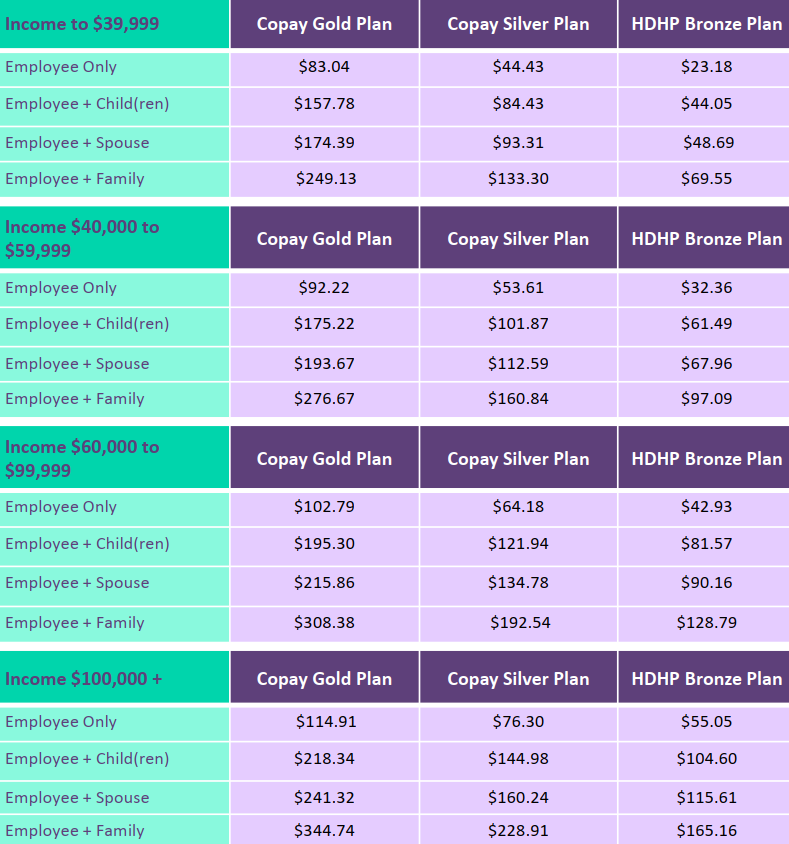 Below are the 2026 employee bi-weekly contributions for the medical plans.
